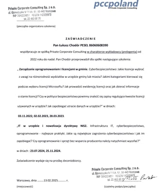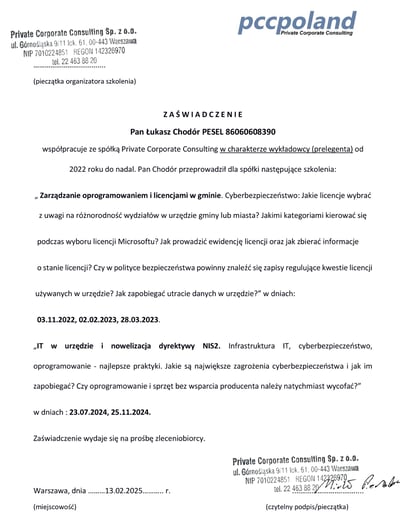 Jako szkoleniowiec specjalizuję się w tematyce bezpieczeństwa informacji, cyberbezpieczeństwie, zarządzeniu w IT. Zrealizowane szkolenia z zakresu: „Zarządzanie oprogramowaniem i licencjami w gminie", „IT w urzędzie i nowelizacja dyrektywy NIS2".
