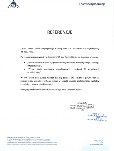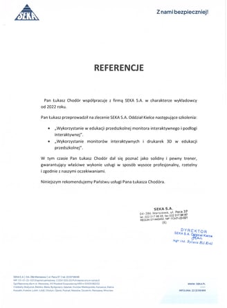 Potwierdzenia wykonanych szkoleń i warsztatów.